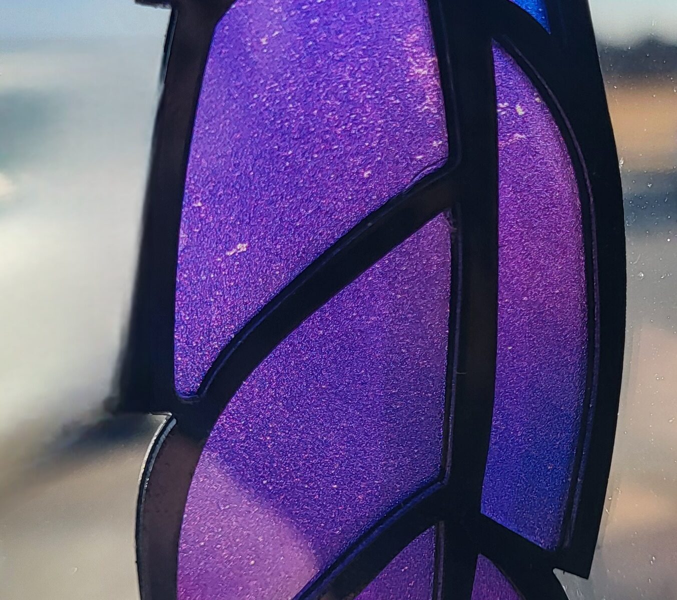 A feather suncatcher that is approximately 5.5in long. Feather has a purple pattern inlay. Feather pattern outline is made from two layers of acrylic.